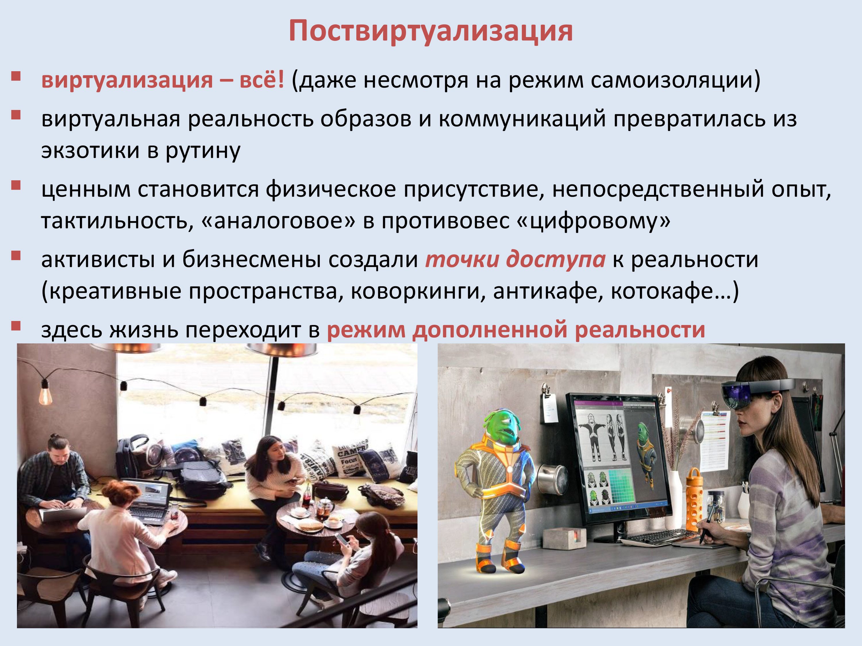 В мире произошло перепроизводство виртуальности, считает г-н Иванов. Есть вероятность, что в результате этих месяцев, когда вся экономическая политическая и повседневная жизнь вынужденно ушла в онлайн, в обществе возникнет дефицит реальности, повышенный спрос на всё аналоговое, на тактильные ощущения и личные контакты. В этих условиях стоит задуматься о создании новых точек доступа к реальности.