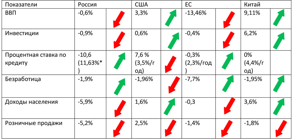 Если проанализировать основные показатели состояния ведущих экономик мира и России, то можно сделать вывод, что больше всего пострадала Россия, где почти все показатели в «красной» отрицательной зоне, и отчасти Европа. В тоже время, у США и Китая не так всё плохо.