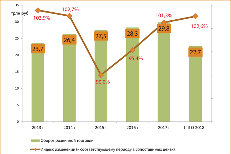 По данным обзора ГК «БестЪ», в 2017 году оборот розничной торговли в РФ составил почти 30 трлн рублей. За три квартала 2018-го он достиг почти 23 трлн рублей — на 2,5% больше, чем за тот же период прошлого года.